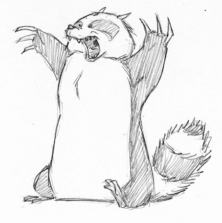 WHEN PENCOONS ATTACK! Pencoons are not naturally agressive critters. However, they are wild animals and should not be appoached or tampered with in their natural habitat. Few are the reports of pencoon attacks, yet they have been known to mutilate and disembowl the occasional livestock that has strayed from the safety of its herd. There are no known cases of people being killed by pencoons, but the disappearances of various locals in suspected pencoon territory have been attributed to the animals. It is theorized that if a pencoon is cornered, as with racoons, it becomes hostile. There is evidence from skeletal remains of retractible claws in the powerful forelimbs that could be used for hunting, defense, digging, and climbing. |